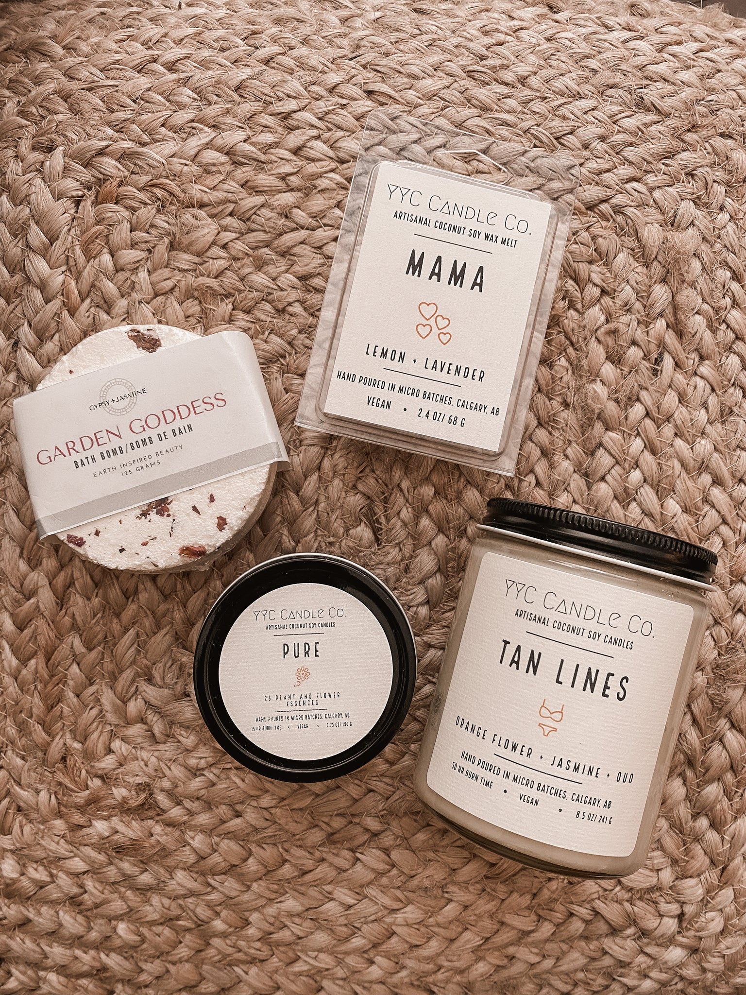 We’ve teamed up with local small business Wanderlust + Jasmine to create this one of a kind gift box. Included in each box is 5 hand crafted, made in YYC self care products. One full size 8.5oz coconut soy candle in the scent of your choosing, a 4 oz tin of our Pure candle, our BRAND NEW wax melt Mama, a beautiful 740ml glass jar of Self Love bath soak and the beautiful Garden Goddess rose petal infused bath bomb. Also available without the bath soak for $60.